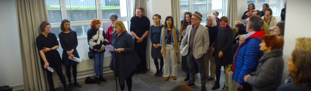 Die Gastgeber vom Reutlinger Kunstmuseum hatten mit Jolanda Bozzetti und Anna Katharina Thaler das Jury-Trio um Kuratorin Bettina Michel komplettiert. Sie teilten sich auch eine Einführung, nachdem Tanja Niederholt für den regionalen VKBW die überraschend vielen Gäste begrüßt und die Ausstellung eröffnet hatte. Tanja Niederfeld selbst war mit drei Arbeiten unter dem einheitlichen Titel („Resonanz“) im mittleren Segment vertreten: zwei flächigen Farbholzschnitten im quadratischen Mittelformat und einem dystopisch düsteren Diptychon, einem Linolschnitt, dessen Druckfarbe sie durch Acryl ergänzte.