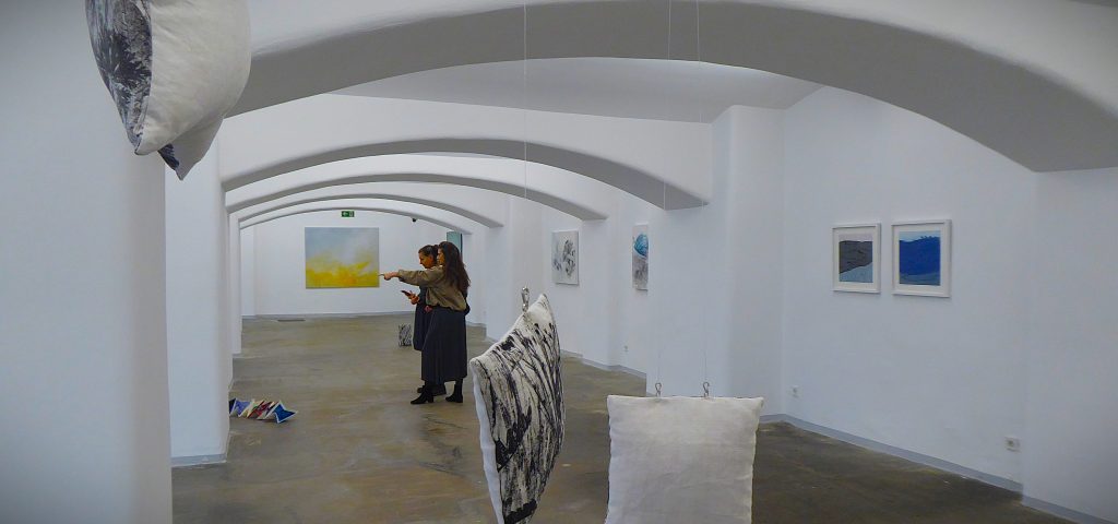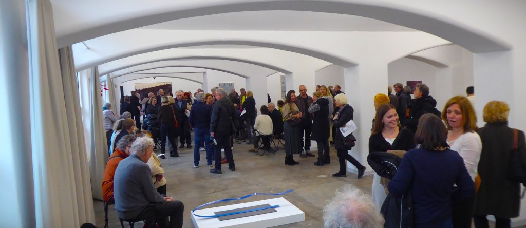 Auf dem Titelfoto sind zwei Installationen von Ulrike Franz zu sehen, die den hinteren Teilraum prägen. Der Kategorie Konzeptkunst könnte man die „Künstlerbücher“ zuordnen, die sie auf einem Tisch versammelt hat. Papier ist das wichtigste Material für die Installation, das Environment „Blues & Jeans“, das sich weniger der Bekleidung, der Musik oder der Trauer widmet als vielmehr Elementarem: der Luft mit zwei eigenwillig gefalteten Schlangen, die zum Boden reichen, auf dem zwei Hügel aus Papierschnipseln den Boden, die Erde bedecken, sorgsam angehäuft.