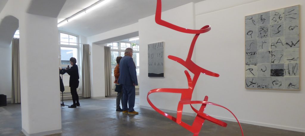 Sie sind raumgreifend und raumprägend, aber auch sehr filigran: die Arbeiten von Susanne Immer aus Aluminium. Die „Welle“ ist ein so zartes, blau lackiertes Metallband, dass es ein Windzug in sanfte Schwingung versetzen kann. Trotz knallroter Beschichtung des Metalls wirken die beiden anderen Plastiken ganz luftig, leicht und transparent.
