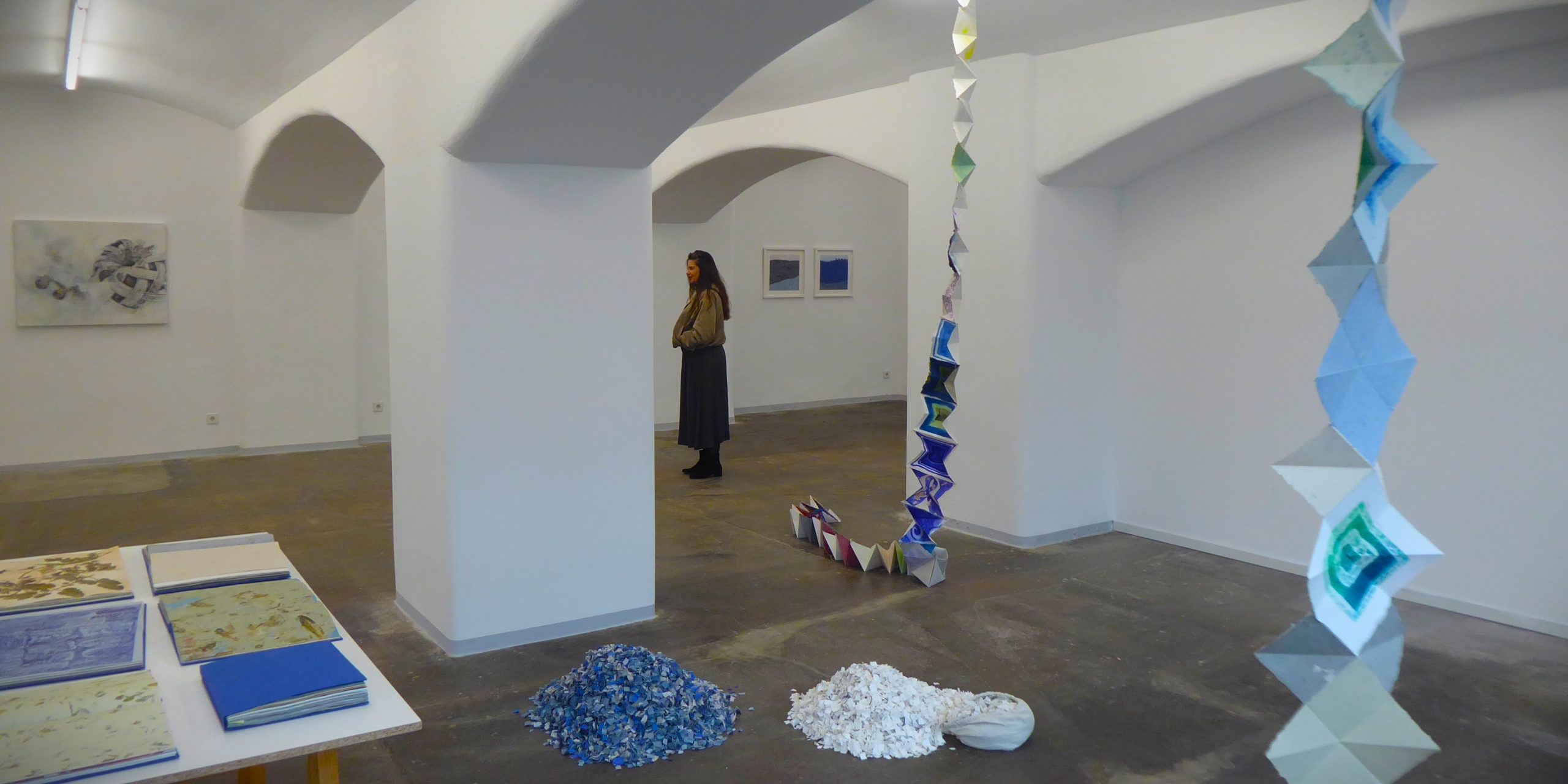 Auf dem Titelfoto sind zwei Installationen von Ulrike Franz zu sehen, die den hinteren Teilraum prägen. Der Kategorie Konzeptkunst könnte man die „Künstlerbücher“ zuordnen, die sie auf einem Tisch versammelt hat. Papier ist das wichtigste Material für die Installation, das Environment „Blues & Jeans“, das sich weniger der Bekleidung, der Musik oder der Trauer widmet als vielmehr Elementarem: der Luft mit zwei eigenwillig gefalteten Schlangen, die zum Boden reichen, auf dem zwei Hügel aus Papierschnipseln den Boden, die Erde bedecken, sorgsam angehäuft.