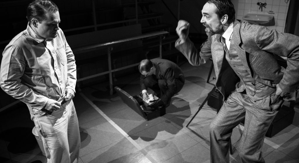 So etwas geht auf dem Theater natürlich nur, wenn auf schauspielerische Intensität zurückgegriffen werden kann. Die Nebenrollen sollen nicht kleingeschrieben werden, Lucas Riedle als Protokollant nicht, und auch Immanuel Krehl nicht als Zeuge und Fast-Opfer Kress. Schon Rolf Kindermann als Vernehmer, unaufdringlich gezeichnet, ist wirklich ausgezeichnet. Aber Stephan Weber als Haarmann liefert ein ganz großes Solo ab.