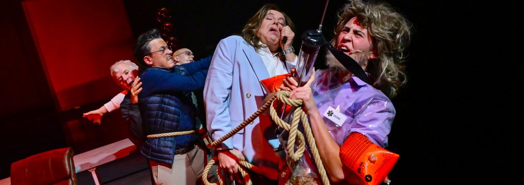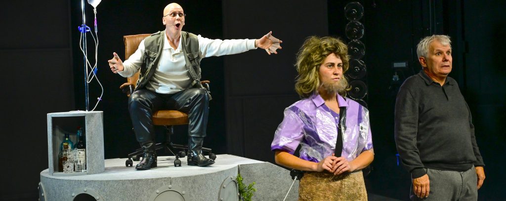 TÜBINGEN. „Doping“ ist eine ziemlich surrealistische Satire, die doch provozierend nah an der politischen Realität und an gesellschaftlicher Wirklichkeit bleibt. Malena Große hat die Komödie von Nora Abdel-Maksoud fürs Tübinger LTT inszeniert. Dass sie sich „gegen eine gender- & alterstypische Besetzung“ entschieden hat, macht die Sache etwas anstrengend für die Schauspieler und die Zuschauer. Trotzdem wurde viel gelacht am Samstagabend bei der ausverkauften Premiere in der Werkstatt.