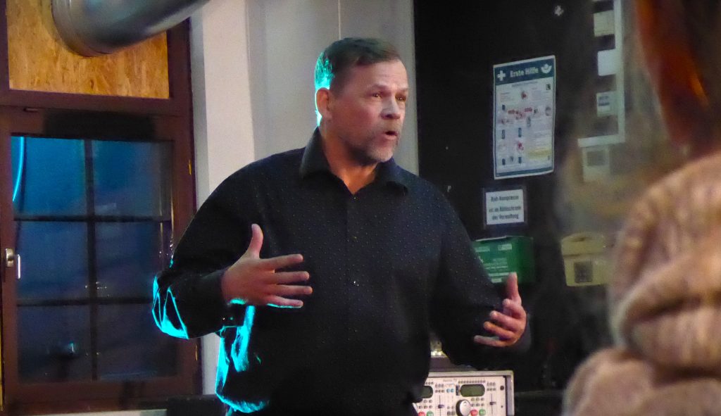 Spätestens, als er auf die „hauptberuflichen Gutachter“ zu sprechen kommt, die „Macht über das Schicksal“ haben, über Vernichtung und leere Reihen oder Vergötterung und volles Haus, aber auch „Plattköpfe, inkompetente, seelenlose Schreiberlinge“ sein können, gibt es aus der düster gedrückten, jedenfalls eher melancholischen Stimmung heraus erste Gluckser im Publikum; und laute Lacher erntet Bringmann, als er, vielleicht zielsicher, vor dem realen Kritiker-Kollegen Ertle in der ersten Reihe niederkniet, der das mit Fassung trägt.