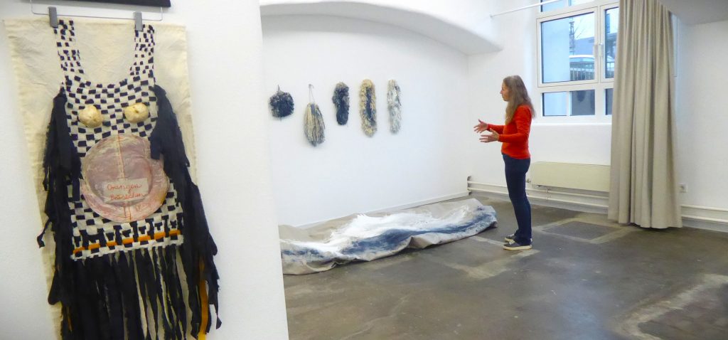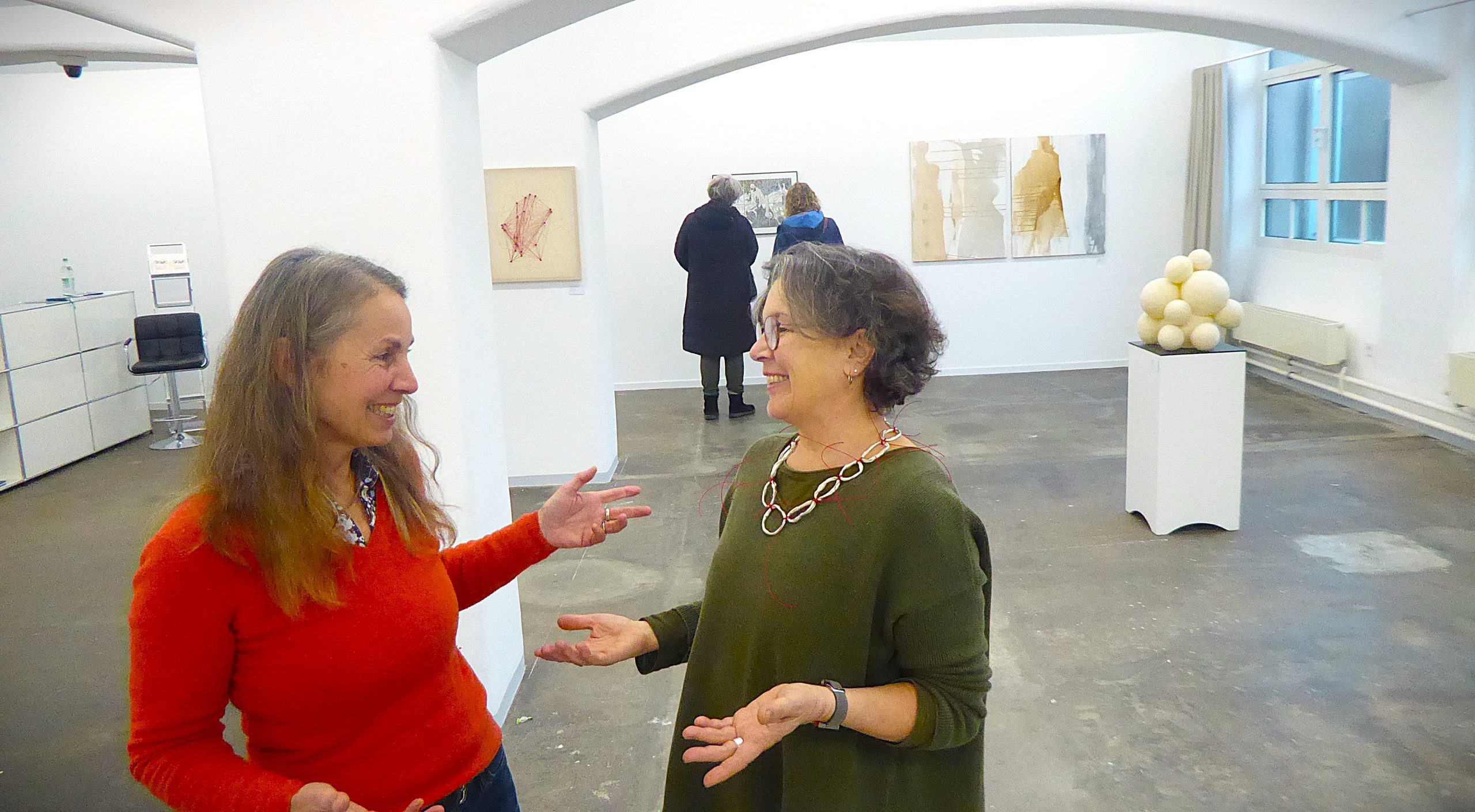An diesem Donnerstagnachmittag hat die Goldschmiedemeistern Barbara Kollross die Aufsicht. Ihre Arbeit „eigenwillig, plastisch, verbunden“ passt als Angewandte Kunst, als ArtDesign ganz genau zu Ziel und Zweck, zum Thema der Ausstellung, die zugleich 100 Jahre des Bundesverbands und 75 Jahre der Regionalgruppe Reutlingen feiern will. Gemeinsam mit der Vorsitzenden Barbara Krämer führt sie durch die sehr sinnfällig unter den weißen Bögen arrangierten Arbeiten in den, trotz des grauen Winterwetters draußen, so licht wirkenden Räumen der Galerie.