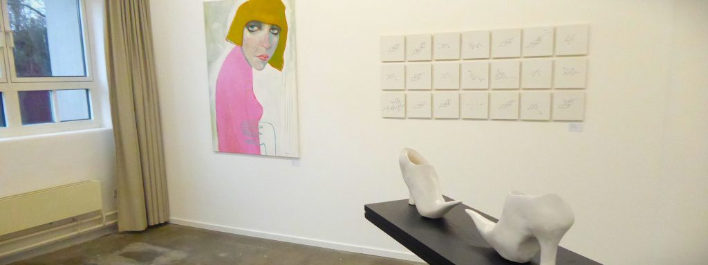 Hinter der Trennwand finden sie in spannendem Bezug zueinander zwei spitze weiße Schnabel-Stöckelschuhe, beengende Pumps aus dem Atelier von Eva Funk-Schwarzenauer, und gegenüber ein flächig neo-expressionistisches Frauenporträt „Think Pink“ von Buket Aslantepe, dazwischen ein Ensemble von 21 weißen Quadraten mit chemischen Formeln darauf von Christine Dohms – die Assoziation mit benachteiligten Wissenschaftlerinnen wie Marie Curie oder Lise Meitner liegt nahe, auch wenn es den Titel „Eva und Adam“ trägt.