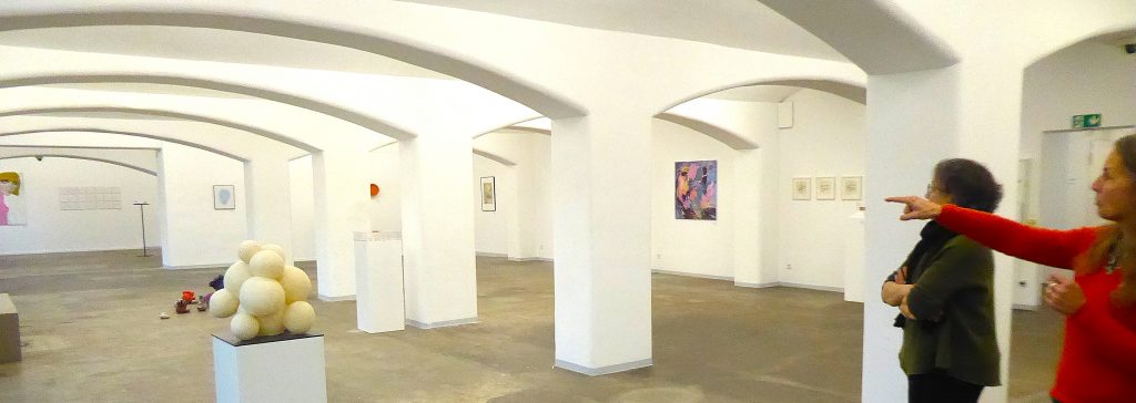 Blick in die Bogenhalle der Ausstellung „Künste. Frauen. Netzwerk“ mit Barbara Kollross und der Gedok-Vorsitzenden Barbara Krämer (rechts) Fotos: Martin Bernklau
