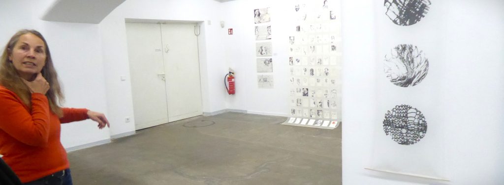 Im dritten Teilraum dominiert Eva Doelker-Heims Installation „Was ich nicht darf“ mit Putz-Utensilien, während an der Säule davor eine Art Rüstung von Annette Hecht-Bauer mit dem Titel „Orangenbrüstchen“ ironisch an den griechischen Mythos der männergleichen Amazonen gemahnen mag. Schräg rückwärtig gegenüber zeigt sich Xenia Muscat mit einer Assemblage von („99 Frauen und eine Rose“) Porträts auf transparenter Textilfolie, dass sie Malerisches (wie bei der Ausstellung in der „Pupille“) ebenso virtuos beherrscht wie bildnerische, auf den Raum bezogene Collage und die auf den Charakter und das Wesentliche reduzierte Zeichnung.