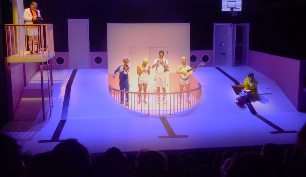 Es wirkt wie das Resultat eines Brainstormings, eine fixe Idee, in die man sich dann schließlich festgebissen hat: Regisseur Turecek, Dramaturgin Christine Richter-Nilsson und Ausstatterin Juliette Collas lassen alle fünf Akte der Handlung in einem Ambiente spielen, das irgendwo zwischen den klinischen Kacheln von Krankenhausk, Freibad und Wellness-Oase angesiedelt scheint. Zwei Rampen, den Übergängen zwischen Flachwasser und Schwimmerbahnen nachempfunden, schließen einen umzäunten Kernbereich ein, zwei sanitäre Funktionsräume am oberen rechten Rand, Klo und Dusche, dienen mit ihren Vorhängen einem munteren Rollenwechsel. Eine Bodenklappe rechts und ein Balkon linkerhand mit Leiter, dazu zwei zusätzliche Hintertürchen, sie alle eröffnen weitere Auf- und Abtrittsmöglichkeiten.