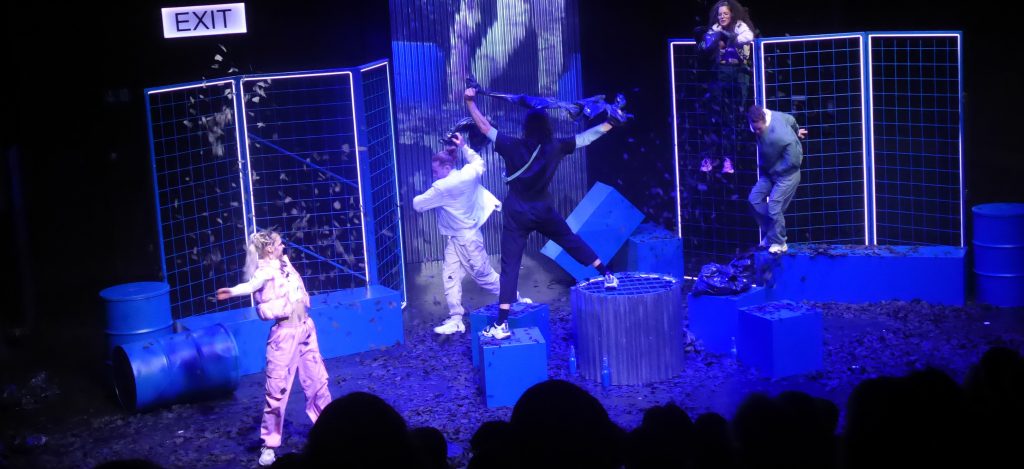 Der Schauplatz ist fantastisch. Sophia Debus hat aus Leuchtgittern, blauen Tonnen und Würfeln sowie einer multifunktionalen Waschtrommel eine Bühne von grafisch-abstrakter Schönheit und hoher Praxistauglichkeit auf dem gewohnt hohem LTT-Level geschaffen. Ihr Quintett hat sie auch sinnfällig kostümiert. Der Dandy Pavlov trägt überm Ärmellosen seinen weißen Anzug, die Klassenschönste und enzyklopädisch über jeglichen Tratsch, auch den ältesten informierte Klatschtante Suse (Anna Golde) führt bauchfrei wattiertes Barbie-Rosa über der edlen Jogging-Hose spazieren. Tolga (Toni Pritschmann) im Prepper-Look und die japanophile „Brille“ Maja (Sophie Aouami) sowie Bo im prollig-rockigen Schwarz komplettieren das Quintett.