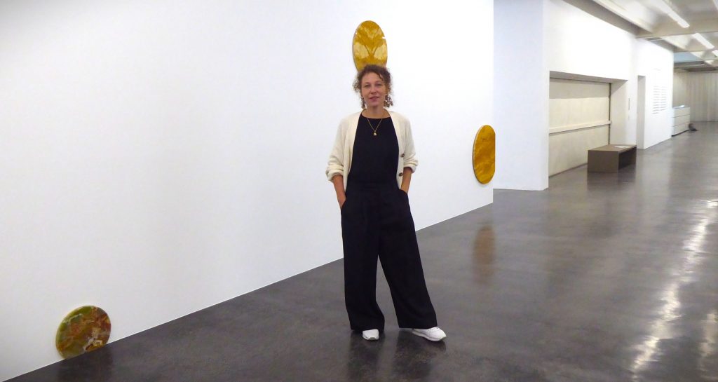 Der meisten Raum nimmt aber der Querschnitt durch die Arbeiten von Linda Carrara ein, von denen die dreiteilige Mondbahn (auf dem Titelfoto) aus unterschiedlich bearbeiteten Travertin- Onyx und Marmorkreisen nur eine ist. Ihr Bodenstück „Above Reality“ ist eine originelle Kombination aus naturschwelgerischem Fotoprint mit drei beweglichen Bronzeguss-Teilen, deren unsichtbare Unterseite golden strahlt. Auch mit dem Marmor, dessen berühmten Namen sie trägt, beschäftigt sich Linda Carrara: mit zwei Stelen, alten Holzbalken beispielsweise, deren Oberseite kein Stein ist, sondern eine täuschend echte Bemalung. Zwei runde Säulen, am Schaft marmoriert oder ein gefalteter Paravent („Polittico“), dessen Vorderseiten Frottagen zeigen, während das Rückwärtige ein aufgemaltes Carrara-Imitat ist. „Falsa Carrara Marble“ ist die Werkreihe betitelt.