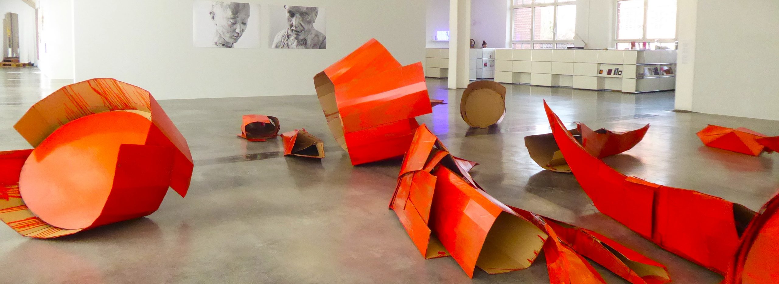 Mit dem ersten Blick fängst es an. Er fällt auf Elisabeth Wagners Arbeit „Lobster“, eine großflächige Bodeninstallation in knalligem Hummer-Rot. Ganz offenbar ist sie figürlich, keine abstrakte Konzeptkunst. Für ein zerlegtes Krustentier sind die Teile eigentlich zu groß. Metalltrümmer eines Unglücks? Mahnmale? Schon der Eindruck von schwerem Material führt in die Irre. Leichtgewichtige Pappe gehört zu den bevorzugten Werkstoffen der Künstlerin. Sie hat aber auch Bleirollen verwendet. An der Wand zwei schwarzweiße Porträtfotos. Nebenan sind filigrane Kuben aus feinstem Metalldraht-Gitter zu sehen. Oder um die Ecke die beiden schweren Keramik-Köpfe zweier historischer Königspersönlichkeiten – sie groß und mächtig, er zierlich und klein (gefertigt nach Bildnissen von Velázquez und Goya).