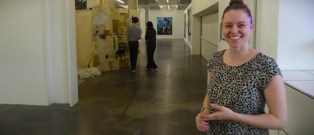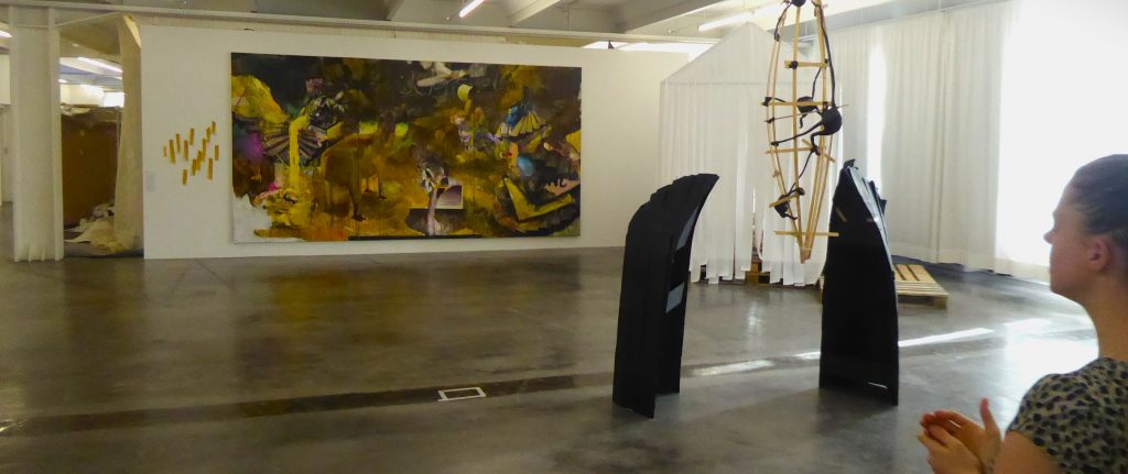Kuratorin und Geschäftsführerin Julia Berghoff hat bei hrer Hängung Sichtachsen geschaffen. Links (auch unten zu sehen) ist die bewusst befremdliche, begehbare Rauminstallation „no before:there you are“ Philipp Kummers (gemeinsam mit Anna Bittersohl) zu erkennen, ein schockieren unwirtlich, aber fast monochrom eingerichteter Raum. Am Ende des Gangs ein farbstarkes, figürliches Großformat. Foto: Martin Bernklau