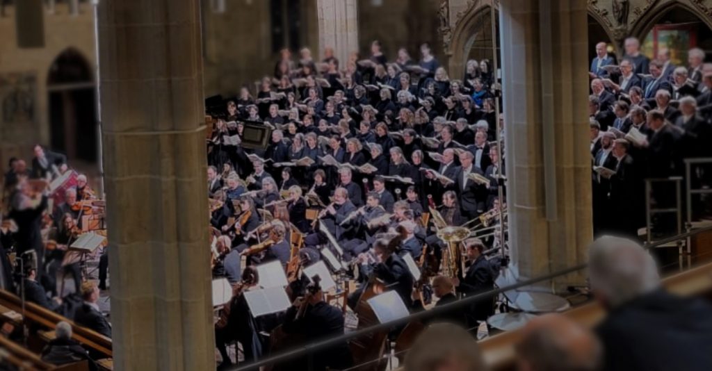 Schon seit 1985 widmet sich der gemischte Chor der evangelischen Studierendengemeinde, die „Kurrende“, großen Meisterwerken; seit damals ohne Unterbrechung geleitet von Benedikt Brändle. Die Chorbesetzung selbst ändert sich natürlich von Jahr zu Jahr aufgrund der Fluktuation der Studierenden. Derzeit findet die „Kurrende“ sichtbar großen Zuspruch, alle Beteiligten sind offenbar begeistert dabei, und die Stiftskirche fasste am Sonntagnachmittag kaum die 100 Chorist/innen, das verstärkte Orchester „Hiemis Aetatis“ und das zahlreich bis in die hintersten Emporenreihen strömende Publikum, das aufgrund organisatorischer Probleme noch nach Konzertbeginn die zugewiesenen Plätze suchte.