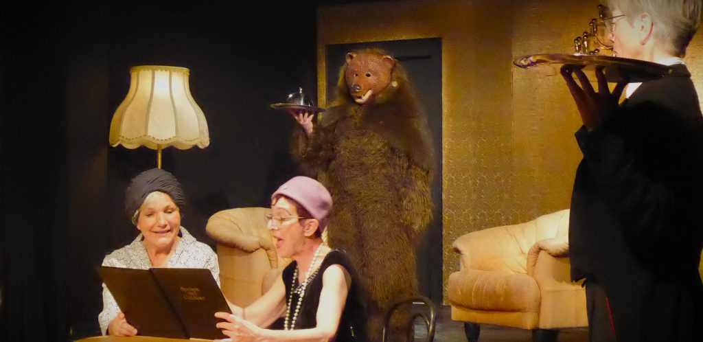 Da geht eine Frauengruppe auf Reisen – Weste, Frack und Kragen gibt es auch, aber sie sind sichtlich männliche Kostümrollen – und landet in einem Grand Hotel ganz alten Stils. Schon in der Lobby kommen nostalgische Gefühle und Gedanken auf bei Babs Gerlach, Waltraud Goller Bertram, Vanessa Geillinger, Margit Neidhart Hübner, Claudia Jochen , Gudrun Keim, Tine Abel und Marion in Gedanken (das ein Nickname, versteht sich). Man macht Selfies, schaut sich um und schaut zurück. Ein Telefon mit Schnur und Scheibe, „echter Marmor!“, ein Salon-Klavier, der Schellackplattenspieler und ein Kleiderständer mit lauter richtigen Pelzen samt Köpfen und Pfoten.