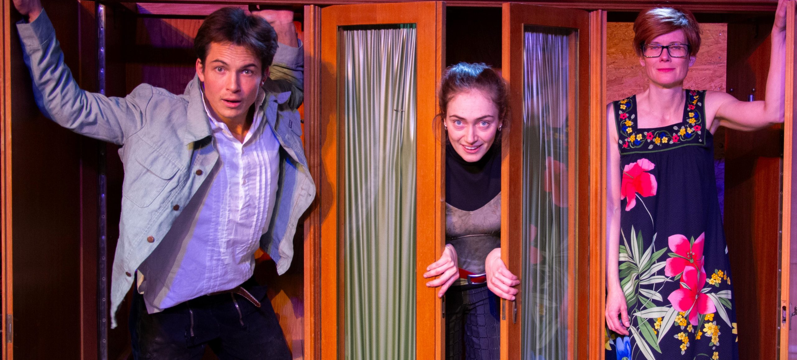 Elias Popp, Linda Schlepps und Hanna im Hof machen das herrlich. Sie wechseln nicht nur blitzartig die Klamotten und geschlechterübergreifend die Figuren. Sie verleihen ihnen ausnahmslos je eigenen Charakter, na, zumindest Kontur. Sie halten dabei auch ein hohes Tempo und glänzen mit situativer und verbaler Komik, die weder Wortwitz noch Slapstick scheut. Alle drei haben ihre Monologe als Glanzlichter (wobei sich schon feine Unterschiede in der Erfahrung, Sprachschulung und Generation bemerken lassen).
