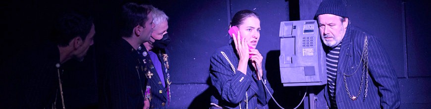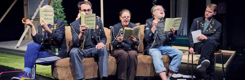 Am Anfang saßen sie in ordenbehängten schwarzen Fantasieuniformen auf der Couch – und am Ende wieder: die Pfeife und das „Prinzip Hoffnung“ in der Hand, rezitierend, beschwörend. Sie nannten sich bei den Vornamen und gestalteten diese theatralische Collage als Sprachrohre ganz verschiedener Heimatsuchender, Heimatvertriebener und Fremder, von Flüchtlingen in neuen Heimaten, die das nicht werden, sondern nur Wohnort, bestenfalls Zuhause bleiben. Sie schlüpften in deren Rollen, auch in allegorische, tobten ihre Wut aus oder zeigten ihre tiefe Trauer und machten Musik mit vielerlei Instrumenten und Gesang aus der „Winterreise“ Franz Schuberts.