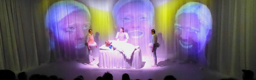 „Die Person“ erwacht unter ihrem Leichentuch schon auf einer Art Bahre. Sie wird sogleich von einem Trio (Insa Jebens, Lucas Riedle, Rosalba Salomon) umsorgt, das als „Maschinen-Chor“ auch per Video-Einspieler seine unmissverständlichen Anweisungen gibt. Die Person lebt da in einer Art Gated Community unter völliger Bevormundung. Ihre eigene Mutter, einzige und letzte lebende Bezugsperson, ist längst in ein Altenheim abgeschoben, bevorzugt altmodische SMS in der verbliebenen Endgeräte-Kommunikation.