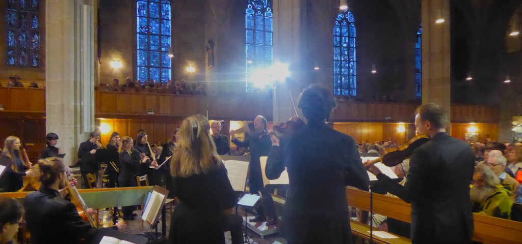Unter der Gesamtleitung des Trossinger Chorprofessors Michael Alber traten Sänger und zwölf Vokalsolisten der dortigen Hochschule unter der Anleitung des Gesangsprofessors und Tenors Jan van Elsacker sowie der Kirchenmusikhochschulen aus dem katholischen Rottenburg und dem evangelischen Tübingen, deren ökumenischen Chor Prof. Marius Mack einstudiert hatte, vor das Publikum einer sehr gut besetzten Stiftskirche. Das historisch orientierte Trossinger „Ensemble des XVII. Jahrhunderts“ unter dem Gamben-Professor Lorenz Duftschmid musizierte mit alten Violinen, Gamben, trompetenhaften Zinken, Naturposaunen, Laute und Theorbe und wurde ergänzt durch Musiker der Schola Cantorum Basiliensis.