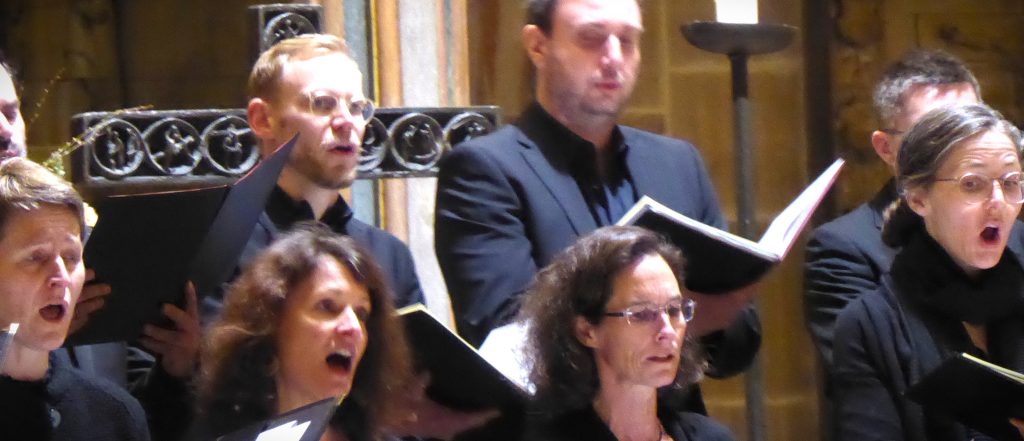 Eine „Elegie“ hat der Schwede Thomas Jennefelt (*1954), ganz am Gesang, auch an der alten Vokalmusik orientiert, ohne einen Text seinen „Gesängen am ersten Abend des Krieges“ als Nr. III beigefügt. Sie beginnt mit einem Ton, den wie ein langsamer Triller chromatische Vorhalte von oben umspielen, was ein gewisses Schwingen oder Beben des Klangs bewirkt. Strukturierte Flächen wechseln mit klopfenden Toneinwürfen oder verhaltenem Summen ab. In Akkorden fanden sich die Einzelstimmen wieder. Es ist eine Art sprachloses Artikulieren, das fast in Richtung einer plastischen Bildhaftigkeit geht, ohne schon Programmmusik zu werden. Sehr suggestiv, sehr eindrücklich unter dem so präzisen wie dezenten Dirigat von Matthias Klosinski.
