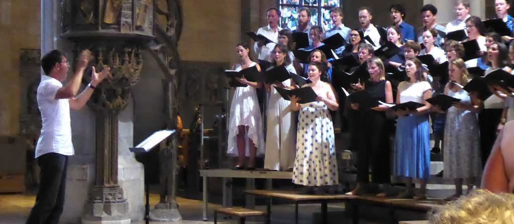 Das „Nearer, My God, to Thee“ ist ein inniges Glaubensbekenntnis des amerikanischen Kirchenmusikers und Pädagogen Lowell Mason, hier in einem Arrangement von James L. Stevens. Dem Introitus mit Cantus firmus im Sopran ließ der Chor ganz aufmerksam und sicher bis zum frischen Schluss-Ruf den ganz eigenen Ton dieser Musik folgen, wobei die an Stimmzahl deutlich unterrepräsentierten Männer sich bewundernswert gut schlugen.