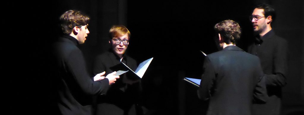 Für das „O salutaris Hostia“ (nach Thomas von Aquin) von Pierre de la Rue (1452 bis 1518) fanden sich die vier Sänger dann im freien Raum mittschiffs zusammen, während Matthias Anton für seine antiphon-artigen Ergänzungen irgendwo im Halbdunkel der Seitenschiffe oder auf einer Empore verborgen hielt – mit interessanten akustischen Effekten, versteht sich. Die „Mille regretz“ von Josquin folgten a cappella und mit wunderschönem Aufblühen.