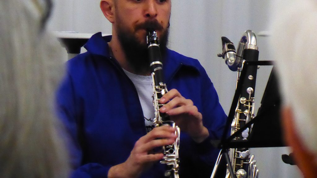 Das allerdings tut Ohren körperlich weh, die ein Leben lang auf reine Töne trainiert worden sind, und die schon mit Viertelstönen indischer oder arabischer Musik ihre schmerzhaften Schwierigkeiten haben. Das allerding passt zum Punk, dessen aggressive Motorik auch in den Werken von Michael Pelzel (*1978) „Colours of Transition“, einer Uraufführung und von Bernhard Gander, Jahrgang 1969, durchhörbar war: „Kneel till Doom“ hieß diese „Antiphon für Bassklarinette, Sopransaxophon und Keyboard“, mit denen das Punk-Konzert andererArt in großem Beifall endete.
