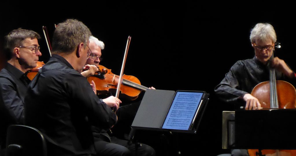 Sicher zur Freude von Tim Vogler noch etwas primgeigenlastig, durfte darin doch auch die Bratsche (Stefan Fehlandt) sehr eigenständig heraus- und hervortreten. Bis hin zum ganz einheitlichen, engen Vibrato aus dem Handgelenk und der markant genauen Bogenführung sind sich die vier Musiker in der Spielweise doch sehr ähnlich geworden – wobei Frank Reinecke als zweiter Geiger und Cellist Stephan Forck eher eine strukturgebende als eine expressiv solistische Rolle bevorzugen.