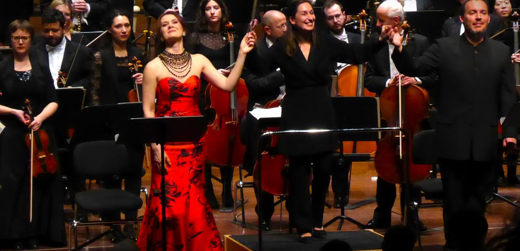 Das Publikum feierte aber auch diese ungeheure Wucht des Klangs, feierte die Solisten und die Dirigentin, die wiederum den einzelnen Gruppen und solistisch hervorgetretenen Instrumenten (dazu zählten auch Harfe, Harmonium, Celesta, Piccoloflöte natürlich, Englischhorn oder das ganze Schlagzeug-Arsenal bis zu Gong und großer Trommel, nicht zu vergessen die verfremdenden Dämpfer selbst bei der Tuba) mit sichtlicher Dankbarkeit für ihren Einsatz applaudierte. Ein schöner Zug.