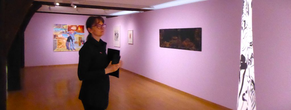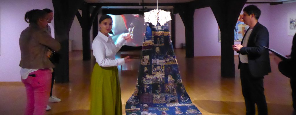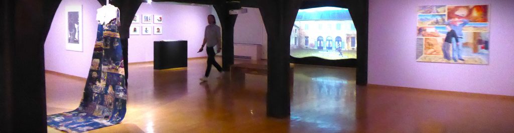 Die obere Etage dominiert eine multimediale Arbeit von Jérémie Danon um das zeitgeistig abgewandelte Märchenthema der Prinzessin: „Il ètait une fois enthéorie“, was soviel bedeutet wie: „Es war einmal, theoretisch“. Das ist ein Film von knapp 24 Minuten Länge, der in Dauerschleife auf einer großen Leinwand mit jugenstilhaft geschwungenem Schwarzrahmen läuft. Die Besucher werden aber zunächst von einem opulenten blauen Kostüm-Umhang mit Keramikbesatz empfangen, der zur Ausstattung gehört. Figuren, Szenen und Motive hat Danon auch in einer Serie von Ölbildern stillgestellt. Die Künstlerin Alice Billaud hat zudem einen Spiegel mit Jugendstil-Keramikrahmen sowie ein „Zerbrochenes Schwert“ leihweise zur Verfügung gestellt, das im Film eine Rolle spielt.
