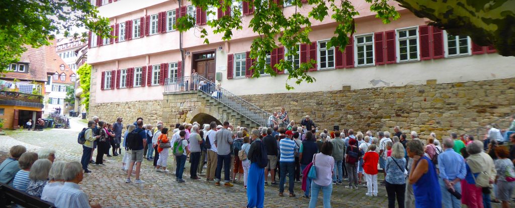TÜBINGEN. Die Geister, die sie rief, die „Kleine große Stadt“ Tübingen, und die Geister, von denen jene der jüngeren Zeit gerufen wurden, sie wirkten und wohnten hier, in diesem magischen Quadrat zwischen Hölderlinturm, Stift, Rathaus und Pfleghof. Auf den Stufen der Alten Burse begrüßte der Theologe, Autor und Kulturkenner Karl-Josef Kuschel mit Kulturamtsleiterin Dagmar Waizenegger am späten Montagnachmittag bestimmt 150 Spaziergänger zu einem Rundgang „Kennen Sie Tübingen?“ an vier Orte von großem geistesgeschichtlichem Gewicht.