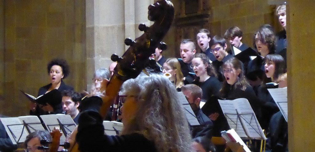 Der Chor war klanglich gewissermaßen etwas deutungsoffen eingestellt, aber absolut sicher in den Einsätzen. Werdende Profis eben, allesamt. Die springlebendige und im Ton elegant leichte Camerata viva zeigte unter der Führung von Konzertmeisterin (und der Kontrabassistin!) – im ganz positiven Sinne – bei aller Aufmerksamkeit gegenüber dem Dirigat eine gewisse gestalterische Selbstständigkeit, manchmal mit einer starker Kontur und „sprechenden“ Akzenten.