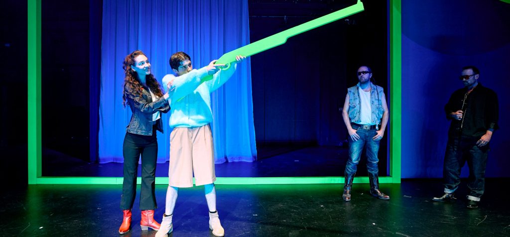 Dömer lässt seine Akteure beim Einlass des Publikums gelangweilt herumlungern vor der Bühne, die Elizaweta Veprinskaja sehr sophisticated und abstrakt gestaltet hat. Über dieses Fensterladen-Viereck mit viel Jägergrün in Neon-Variante hat sie ganz weit oben die fünfköpfige Combo von Johannes Wasikowski platziert, die je nach Bedarf von Michael Schneider, der auch den Vater Bertram spielt, und David Liske, dem virilen Jägerburschen Robert, ergänzt wird. Die erste Leitfarbe: Grün ist das Gewehr, grün der volle Mond, der als Projektionsfläche für die Videos aus dem mit Schleier abgetrennten Backstage-Bereich dient. Blutrot wird folgen.
