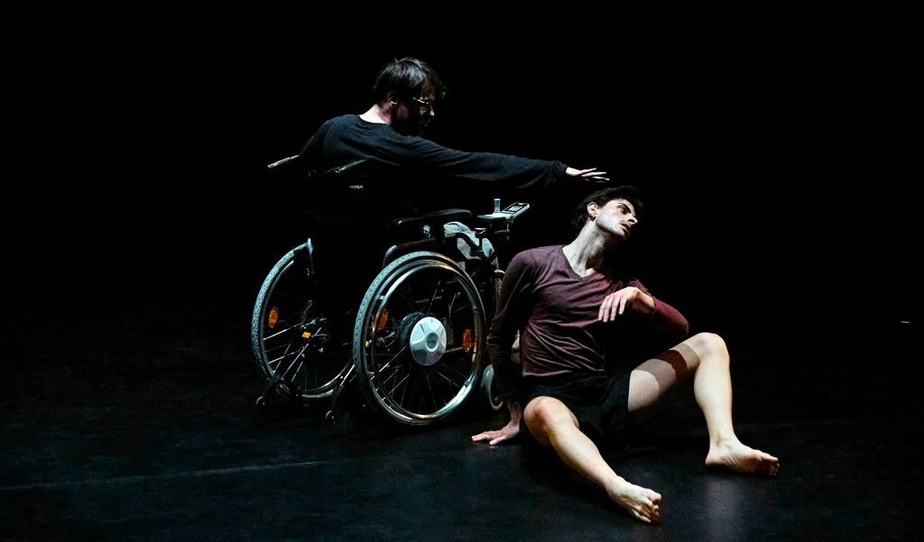 Als Höhepunkt dieser Compagnie-Kooperation darf der Pas de deux gelten, den Davide Benigni, einer der Profis, mit Santiago Österle, einem Rollstuhlfahrer und vielleicht dem heimlichen Star des inklusiven Kollektivs, in sehr anrührender, ja zärtlicher Weise tanzt (siehe das Titelbild).