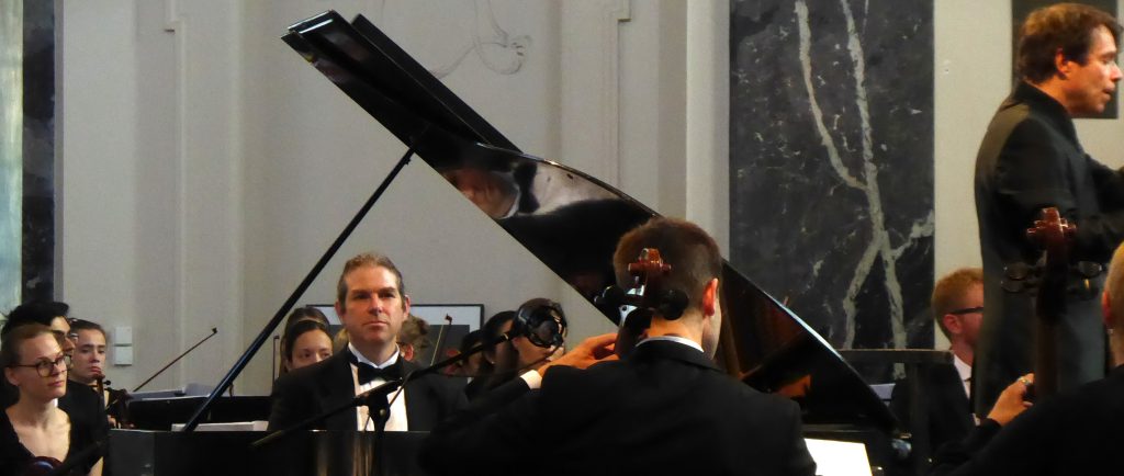 Natürlich ist der junge, doch schon gleich nach seinem Examen in New Jersey lehrende Widmungsträger bestens vorbereitet, vielleicht sogar sorgsam eingewiesen in das kontrastreiche Konzert. Das Akademische Orchester lässt ihm trotz aller Klangfluten und infernalischen Vulkanausbrüche den nötigen Raum für seine vielfältigen Figurationen, die von wuchtigen Akkordfolgen über Fugati, wilde Läufe und Arpeggien bis zu zarten melodiösen Bögen reichen. Die an Mahler geschulte Dramaturgie setzt auf viel Klangfarbe – exemplarisch das Schlagwerk mit den Röhrenglocken, die geradezu Alarm geben – und kennzeichnet die Besetzung und den Satz.
