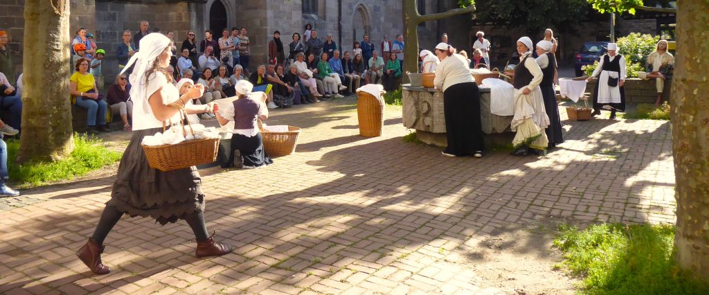 TÜBINGEN. Es ist das, was dem Lindenhoftheater in den 90-ern mit Hölderlin und Rathgeb weltweite Beachtung brachte: Theaterspaziergänge. Das machte das Tübinger „Generationentheater Zeitsprung“ in Zusammenarbeit mit dem LTT jetzt nach. Die frauenstarke Truppe vom Schulalter an weit hinauf widmete sich, von drei Männern verstärkt, als Waschfrauen einem brandaktuellen historischen Datum im Juli vor 110 Jahren, dem Vorabend des ersten großen Weltkriegs: „Große Wäsche, Tübingen 1914“ hieß das von Andrea Bachmann recherchierte und geschriebene, von Helga Kröplin geleitete Stück, das am Samstagabend Premiere hatte.