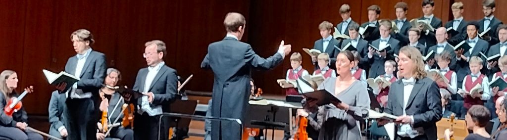 Die Ränge waren fast vollständig besetzt, als Johannes Kaupp, der neue künstlerische Leiter des Reutlinger Knabenchors, in den Teilen I, II, IV und VI seine ganz besonderen Akzente setzte. Die Capella vocalis scheint sich inzwischen doch ganz gut von der Corona-Krise erholt zu haben. Die rund vierzig Stimmen des Konzertchors waren angehalten, vibratofrei zu singen. Ob das bei den Uraufführungen des Jahreswechsels 1734/35 in den Leipziger Hauptkirchen – vormittags Thomaskirche, nachmittags Nikolai – auch so war, sei mal dahingestellt.