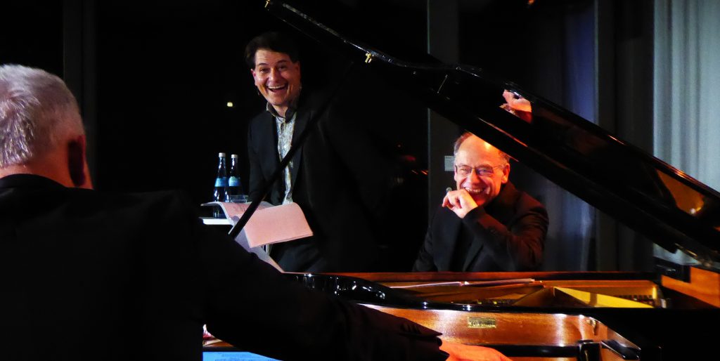 So war das Prinzip: Nach der launigen Begrüßung und profunden Einführung durch Achim Stricker spielte das Duo die drei Sätze des ungefähr viertelstündigen Werks en bloc. Dann kam der ungemein erhellende Analyse-Teil mit Klangbeispielen in freiem Gespräch, ausgreifend auch in die Geschichte und das Biografische, aber auch als klare Deutung der Noten in Harmonie und Rhythmik samt fesselnden Einblicken bis tief in pianistische Probleme und Nuancen. Bei allen weit schweifenden, nie weitschweifigen Exkursen: kein Wort zuviel, alles hochspannend. Und schließlich die Wiederholung, das „Encore“, das Noch-Einmal. Ein ganz großartiges Gesprächskonzert. So soll es sein.