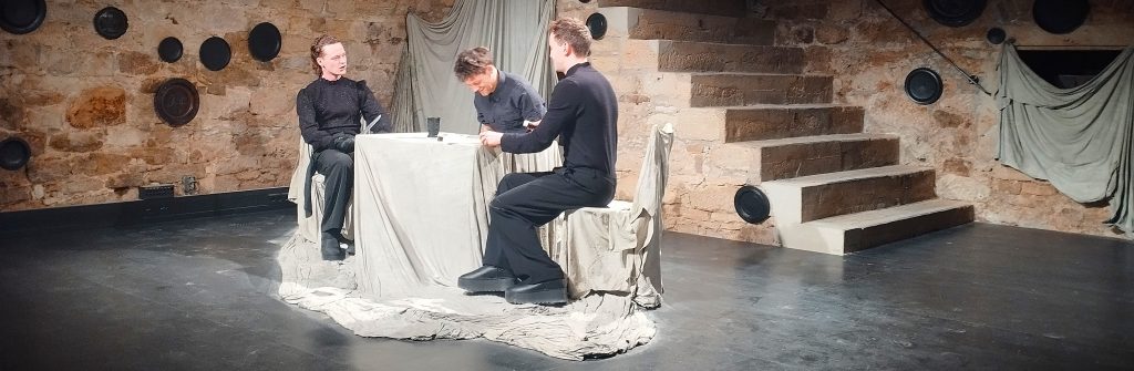 Die Regie des Autors hätte allenfalls noch den geschulten hohen Theaterton von Cyril Hilfiker (Karl) etwas mehr der umgangssprachlichen Diktion seiner Widerparts Jel Woschni als Henrik und Julian Lehr (Rasmus) anpassen können. Auch Karls Ausbruch beim Geldzählen nach dem Geldwaschen gerät gar zu heftig theatralisch im Vergleich. Das Trio spielt trotzdem ausgezeichnet. Aber Ripbergers Text ist eine mittlere Katastrophe: kindisch kalauernd und wortverspielt, mäßig komisch, wenig spannend, dabei aber so sinnfrei belanglos und bedeutungslos wie die banalen Horror-Elemente etwa von der Leiche im Keller . „Theatrale Zukunftsforschung“ sollte so langweilig eigentlich nicht sein. „Im Office“, das Parallel-Stück mit seiner selbstironisch witzigen Wokeness, ist da wahrhaftig weit geistreicher und ergiebiger.