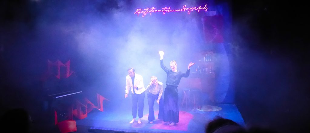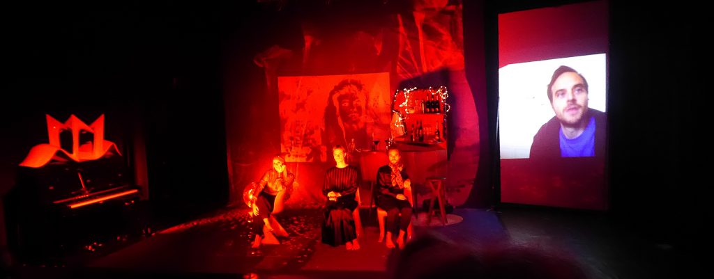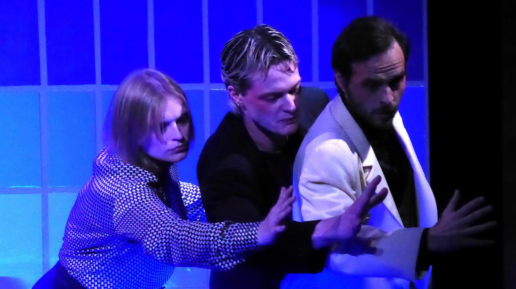 Hochvirtuos dekliniert sie allerdings zuvor ihre – gegendert erzählende – Suada in erster und dritter Person durch: „Ich bin kein Witz, denkt sich die Tod“, als allegorische Figur, die immer wieder an queere Türen klopft. Während schauspielerische Leistungen nicht beurteilt werden können, weil es nichts zu spielen gab, verdienen die Sprech-Leistungen des Trios doch höchstes Lob, auch wenn die Sprache – um im Jargon zu bleiben – „durchgefickt“ wird wie beim notorisch gefeierten Analsex im Darkroom, der Schwulensauna oder der „Klappe“. Auch die langen Passagen in ähnlich obszönem Englisch sind sauber akzentarm einstudiert.