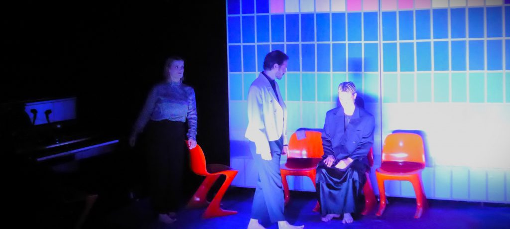 Ein Trio aus Johanna Engel, Stefan Herrmann und Jel Woschni trat in dem Stück von Marcus Peter Tesch, das keines ist, als eine Art Berliner Studenten-WG in Zeitlupe auf die Bühne und deklamierte sitzend – teils in „drastisch sexueller Sprache“ – von orangenen Pop-Art-Stühlen aus und vor gegenfarbigen Kacheln (Ausstattung: Clara Rosina Straßer) eine endlose, viertelstündige Widmungs-Litanei an die Aids-Toten aus der „queeren“ und der Junkie-Szene. Afrika fand keine Erwähnung.